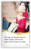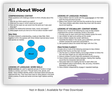 This informational text, and its nonfiction text features, explores how people use wood to do many things, like build homes, cook food, and even play sports.
