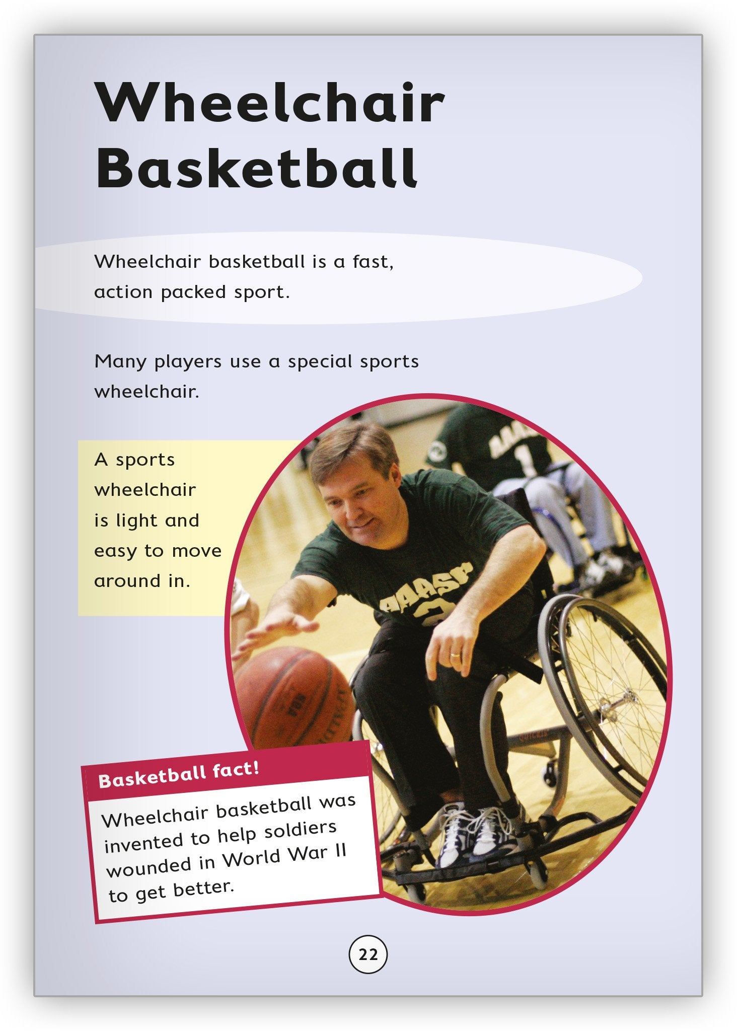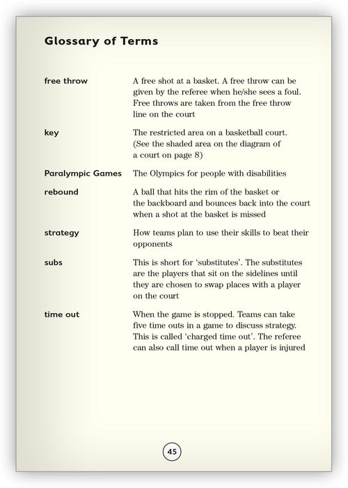This book teaches the fundamentals of basketball along with its key players in history. The narrative text features a boy named Josh who moves to a new town and uses basketball to build friendships.