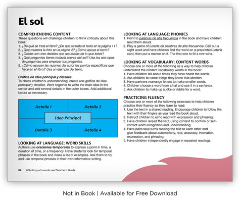 Fábulas y el Mundo Real is a series of authentic Spanish fables and informational texts that have been adapted from English. The series includes 30 intriguing fables, paired with 90 informational texts. Each unique fable is paired with three related, corresponding informational texts, which draw upon the fables' nonfiction elements. Vibrant artwork in the fables helps bilingual, dual language, and Spanish teachers educate students on important lessons and morals, and engaging visual support and great nonfiction text features in the informational texts help to improve critical Spanish literacy skills. The series includes 120 leveled readers in total, 10 of which are available as big books.