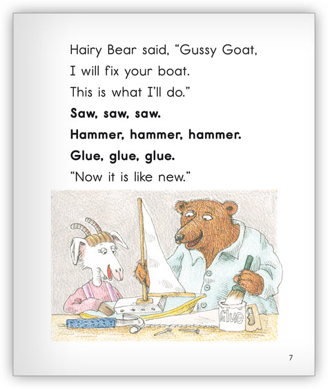 World-renowned author Joy Cowley tells the story of Hairy Bear who is trusted by Gussy Goat, Freddy Fox, and Betty Bear to fix their things.