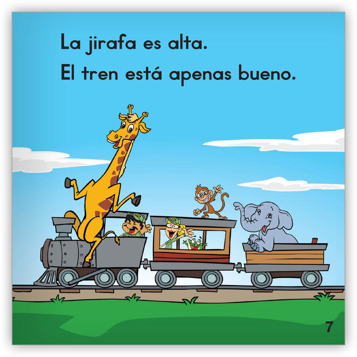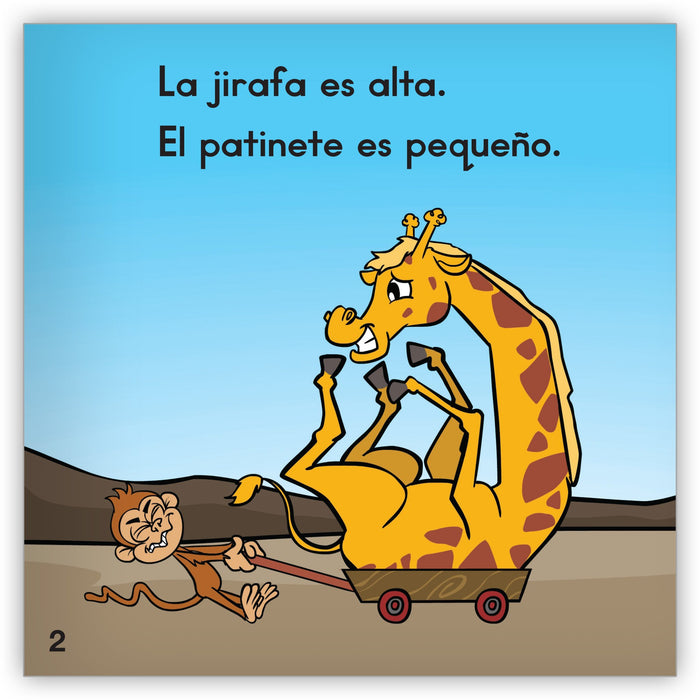 Follow a giraffe in this Spanish narrative text as it struggles to find a ride that will fit its tall body.