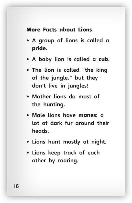 Did you know lions hunt mostly at night? This nonfiction text is a great tool for students to explore lions and their skills, and the bulleted list of lion facts is a helpful way to reinforce information, too!