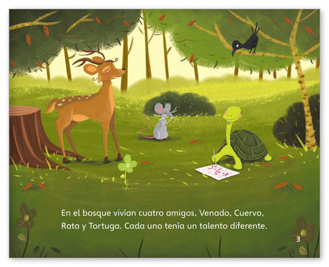 When Turtle becomes ensnared in a hunter's net, she calls for help. Each of her friends (Deer, Crow, and Rat) plays an essential but different role in freeing her before the hunter arrives. The story exemplifies the value of having diverse and unique skills.