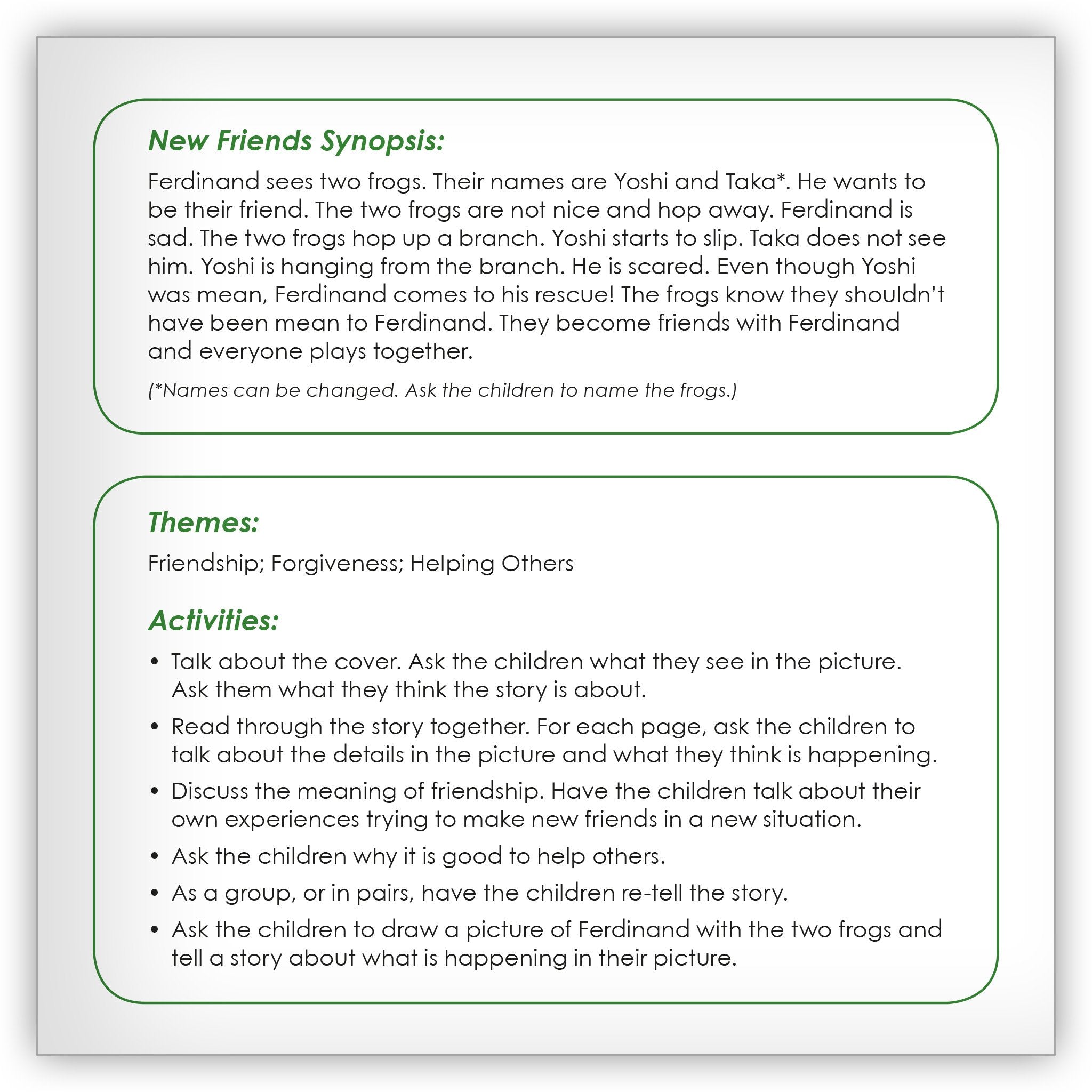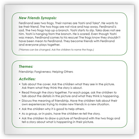 Present students with the opportunity to tell their own stories with the help of this wordless book about frogs, friendship, and forgiveness.