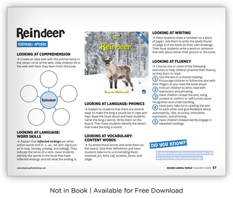 Zoozoo Animal World is a series of appealing informational texts that uncover details about animals in several different habitats, such as the Arctic, desert, farm, forest, and more. Sentences in lower-level books are written with repetitive structures with sight words, and higher-level books incorporate pronouns and grammar skills for more advanced students. The series features 110 leveled readers, 20 of which are available as big books.