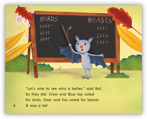 Share the lasting fable of Bat who cannot decide whether to be on a team with the birds or the beasts. A race leaves Bat with a lasting conclusion.