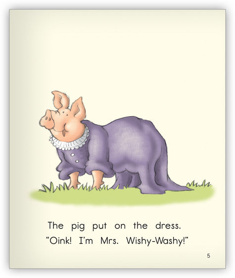 Share the Joy Cowley experience of "learning through laughter" as animals try on Mrs. Wishy-Washy's clothes after she sets them out to dry.