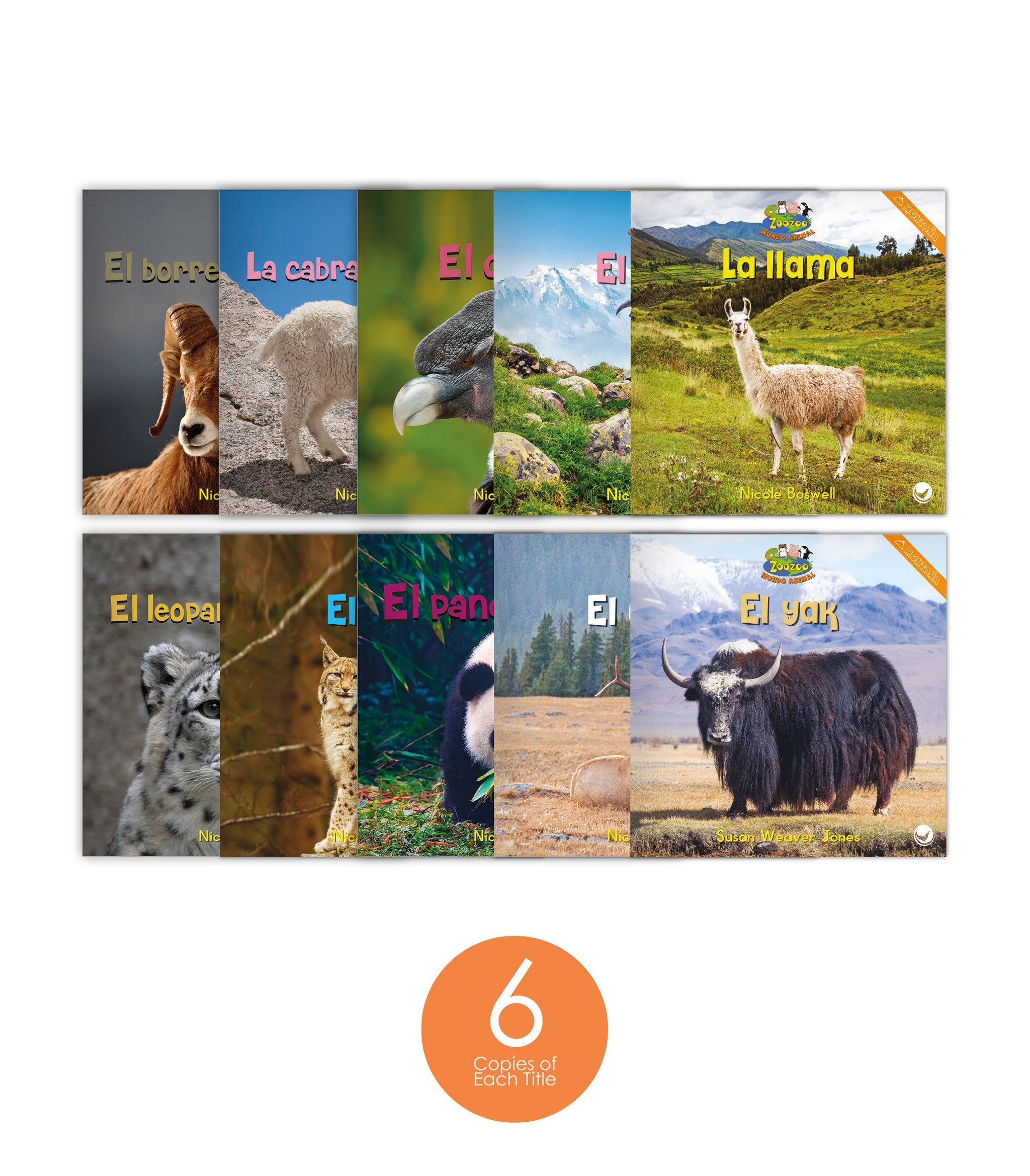 The Zoozoo Mundo Animal Montaña Habitat Set (6-Packs) contains 6 copies of each of the 10 leveled readers in the montaña habitat theme of the Zoozoo Mundo Animal series, for a total of 60 books in Spanish. All titles are nonfiction and have teacher talking points in Spanish. Reading level range: E–G.